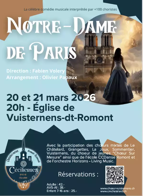 Concert Notre-Dame de Paris avec la participation des choeurs mixtes de Le Châtelard, Grangettes, La Joux, Sommentier, Vuisternens, du choeur de jeunes "Choeur Sur Mesure" ainsi que de l'école CCDanse Romont et de l'orchestre Horizons-Living Music.