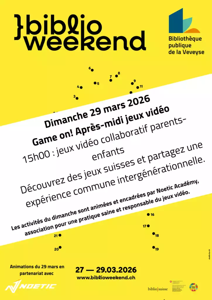15h00: jeux vidéo collaboratif parents-enfants. Découvrez des jeux suisses et partagez une expérience commune intergénérationnelle.