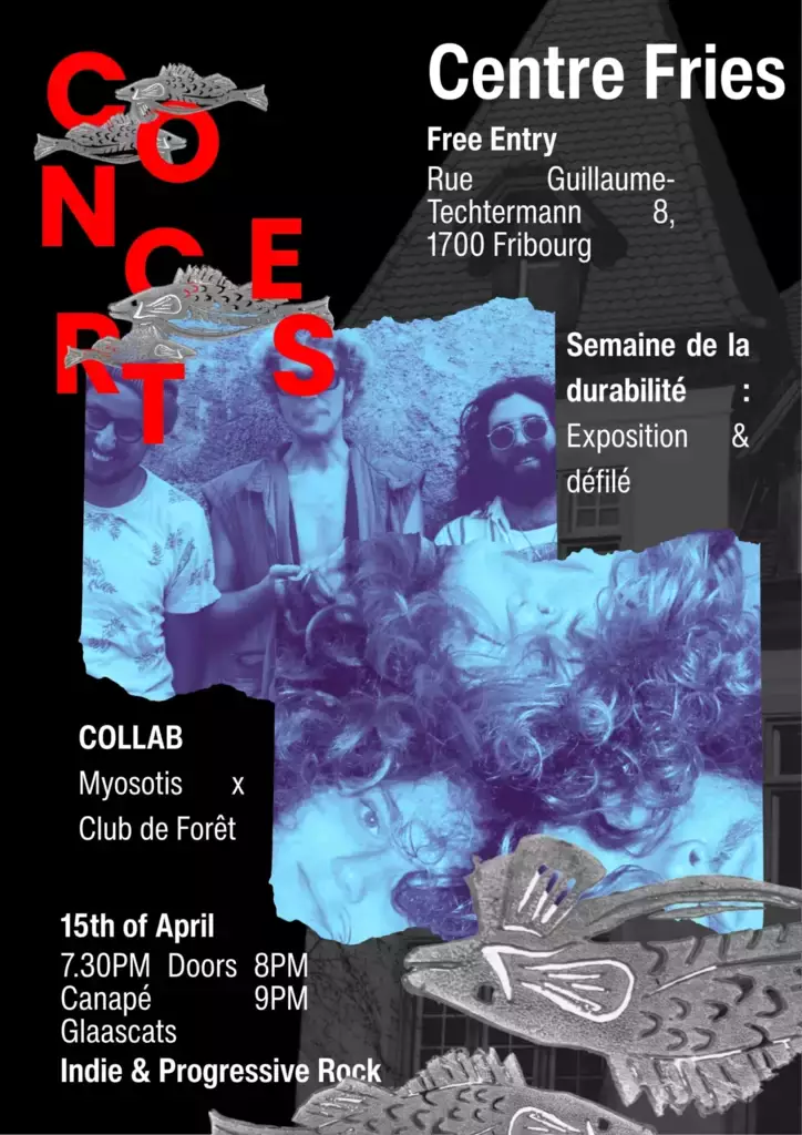 Tauchen Sie ein in die musikalische Welt von Canapé & Glaascats in der intimen Atmosphäre des Centre Fries! Entdecken Sie gleichzeitig die Vereine Myosotis und Club de Forêt im Rahmen einer Ausstellung und einer Modenschau mit Upcycling-Kleidung im Rahmen der Nachhaltigkeitswoche.