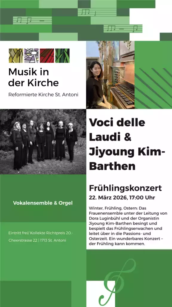 Winter, Frühling, Ostern: Das Frauenensemble «Voci delle Laudi» unter der Leitung von Dora Luginbühl und der Organistin Jiyoung Kim-Barthen besingt und bespielt das Frühlingserwachen und leitet über in die Passions- und Osterzeit. Ein wunderbares Konzert – der Frühling kann kommen.