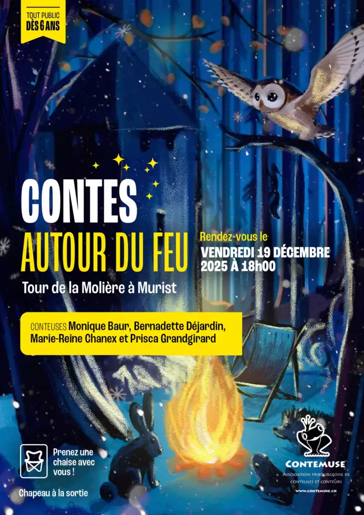 Viens partager un moment magique hors du temps et vivre l'expérience d'une contée traditionnelle pour petits et grands autour du feu dans le cadre enchanteur de la Tour de la Molière à Murist. Pour ton confort, n’oublie pas de prendre une chaise ou une couverture. Et pour les gourmands, après la contée, il y aura possibilité de griller des cervelas ou des marshmallows sur le feu. Les histoires seront racontées par les conteuses Monique Baur, Bernadette Déjardin, Marie-Reine Chanex et Prisca Grandgirard dans le cadre du calendrier de l'avent de Contemuse. La contée aura lieu par tous les temps. Entrée gratuite, chapeau en fin de soirée.