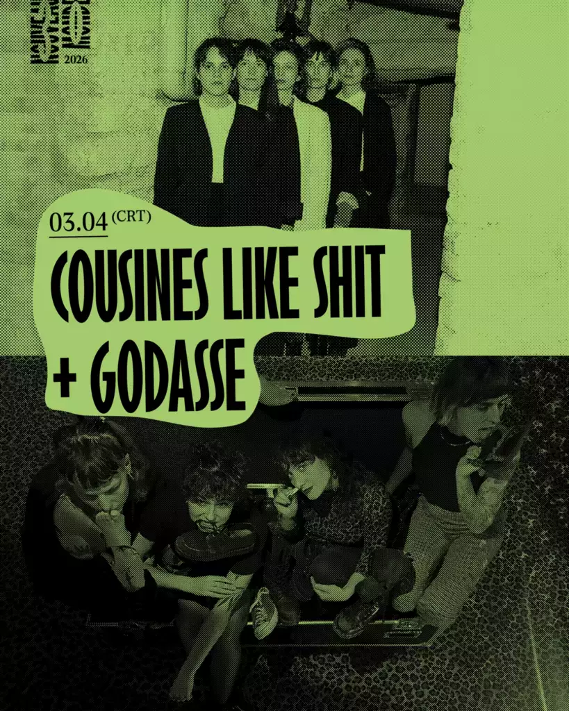 Avant-Trash et Art-Punk ! On invite le coup de coeur du bureau, les nostalgiques de l'indie-quelquechose Cousines like Shit et on attend avec grande impatience la première des Art-Punkeuses de GODASSE, qui rassemble plein de personnes géniales. Venez, hurlez, dansez et glissez sur une flaque de bière.