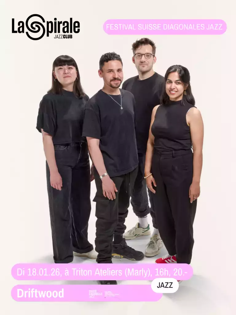 Le Driftwood Quartet évolue avec aisance entre jazz contemporain et rock alternatif. De ses pièces musicales en format miniature se déploient des paysages sonores puissants ponctués de riffs anguleux. Guidé par la curiosité et le goût de l’expérimentation, la guitariste et leader du groupe, Joa Frey, associe des structures inattendues à des mélodies entraînantes. Elle puise son inspiration dans ses expériences personnelles et les miracles de la nature et de la science. Le résultat : des morceaux aux multiples facettes, pleins d’énergie et de profondeur, qui conservent une dynamique claire et fluide.