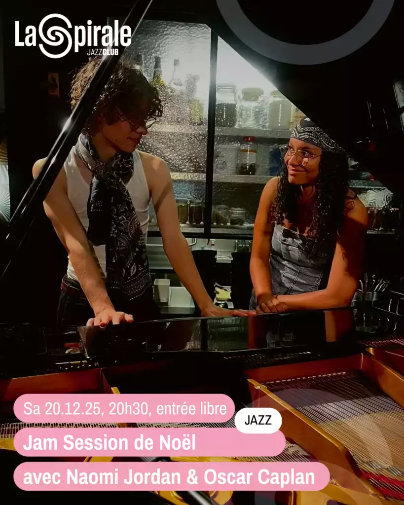 La jam session de Noël est de retour à La Spirale. Aux commandes, Naomi Jordan et Oscar Caplan, deux jeunes pianistes qui viennent de gagner le Prix de La Spirale 2025. A leurs côtés, une rythmique de choc avec Samuel Maumier à la contrebasse et Colin Perritaz à la batterie.