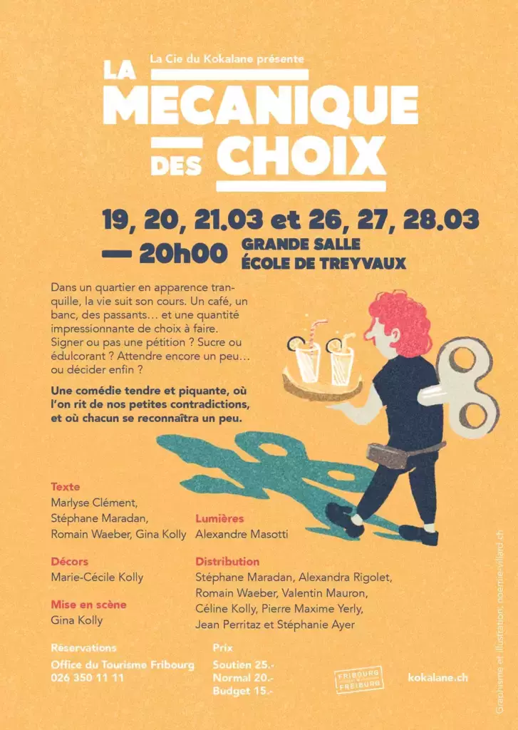 La mécanique des choix, nouveau spectacle de la Cie de Kokalane. Une création d une comédie tendre et puquante qui vous fera rire et passer un bon moment en famille ou entre amis. La grande salle de l'école de Treyvaux sera transformée en magnifique café-théâtre pour un avant et après spectacle riche en convivialité.