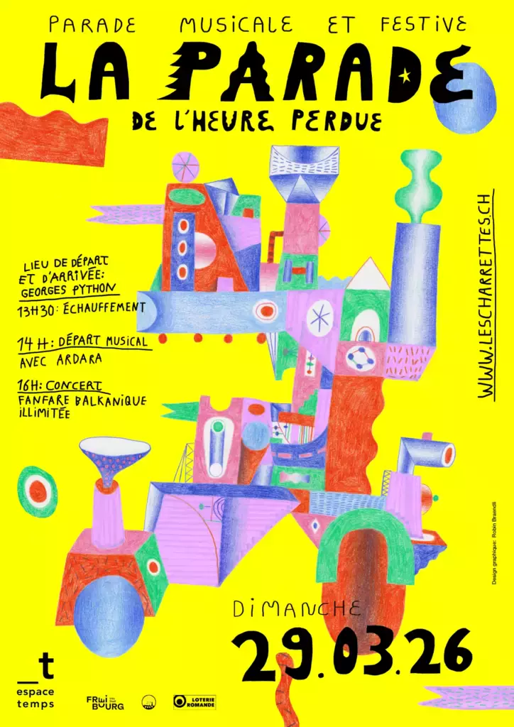 Comme l’année passée la parade de l’Heure Perdue aura lieu le jour du passage à l’heure d’été. Le printemps marqué par ce changement d’heure est aussi pour beaucoup le moment de ressortir et recommencer à organiser des évènements en extérieur. Cette parade est l’occasion pour nous d’offrir un moment festif aux Fribourgeois de tous âges ainsi qu’à tous les collectifs qui ont emprunté les charrettes durant l’année 2025, et ainsi lancer la saison 2026 des CHARRETTES!