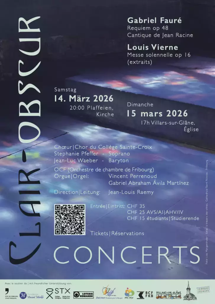 Le Chœur du Collège Sainte-Croix de Fribourg et l'Orchestre de chambre fribourgeois (OCF) présentent Clair-obscur, un concert à découvrir le 14 mars à l'église de Planfayon et le 15 mars à l'église de Villars-sur-Glâne.