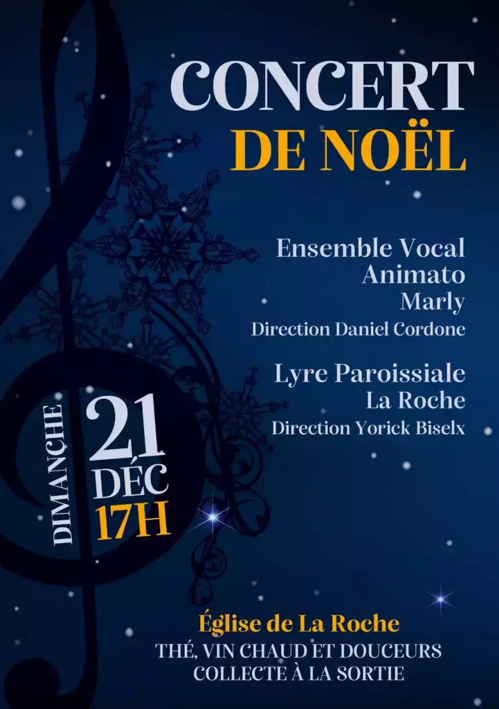 La Lyre Paroissiale de la Roche sous la direction de Yorick Biselx et l'Ensemble Vocal Animato de Marly dirigé par Daniel Cordone donneront un concert de Noël alliant chants d'ici et d'ailleurs et pièces instrumentales. Le concert aura lieu à l'Eglise paroissiale de la Roche, le dimanche 21 décembre 2025 à 17.00. L'entrée est gratuite et une collecte aura lieu à la sortie.