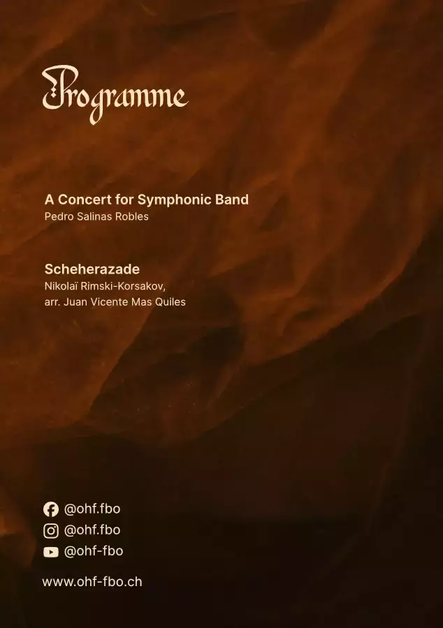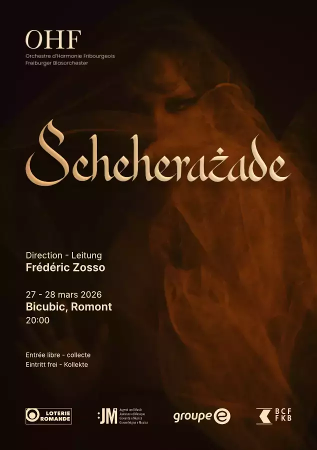 À l’occasion de son concert de printemps, l’Orchestre d’Harmonie Fribourgeois vous propose une immersion dans de vastes paysages sonores, entre ampleur orchestrale et imaginaire oriental. Le programme s’ouvrira avec A Concert for Symphonic Band de Pedro Salinas Robles, une œuvre affirmée et contrastée qui met en valeur toute la richesse de l’orchestre d’harmonie. En seconde partie, place au récit et à l’évasion avec Shéhérazade de Nikolaï Rimski-Korsakov, dans l’arrangement de Juan Vicente Mas Quiles, une grande fresque orchestrale inspirée des légendes des Mille et Une Nuits.