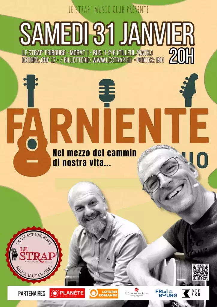 Entre France, Italie, Suisse et ailleurs, ils revisitent les chansons qui ont marqué leur route, les souvenirs qui font encore vibrer, et les grands petits moments qui nous construisent. Un concert-spectacle plein de complicité, d’autodérision et d’émotion, où l’intime devient collectif et la mémoire, musicale. C'est ça, le Duo Farniente!