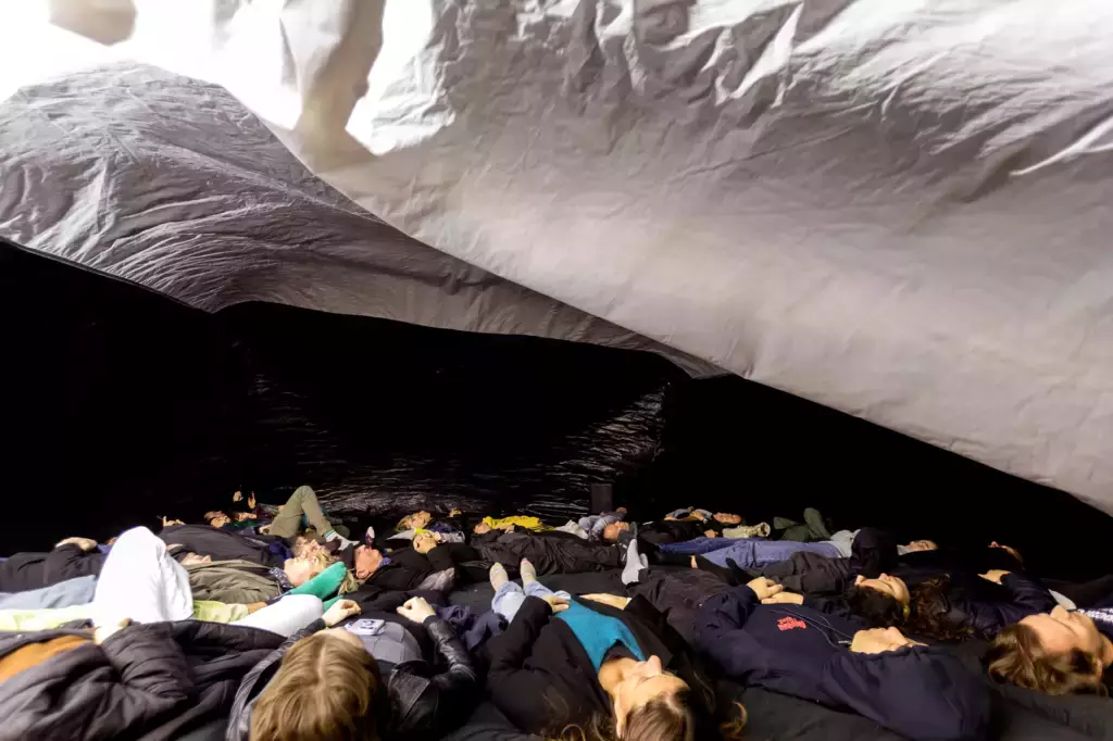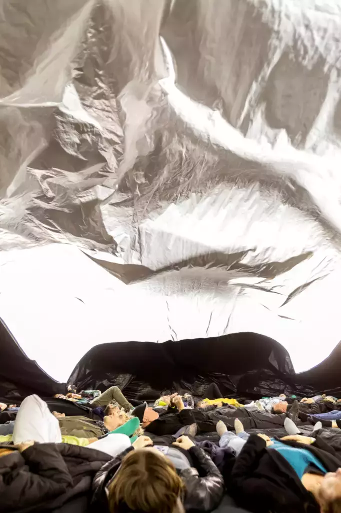 COLLAPSE, le projet de Encor Studio autour de l’artiste fribourgeois Manuel Oberholzer/Feldermelder, est une expérience immersive dans laquelle l’espace prend vie et se transforme. Pendant 25 minutes, 25 personnes se plongent dans une grande structure gonflable, allongées sur des tapis, englobées par un sound system 5.1 et des images projetées à 360°. Les artistes interagissent avec la structure, provoquant des ondes et des vibrations qui font de chaque performance une expérience singulière.