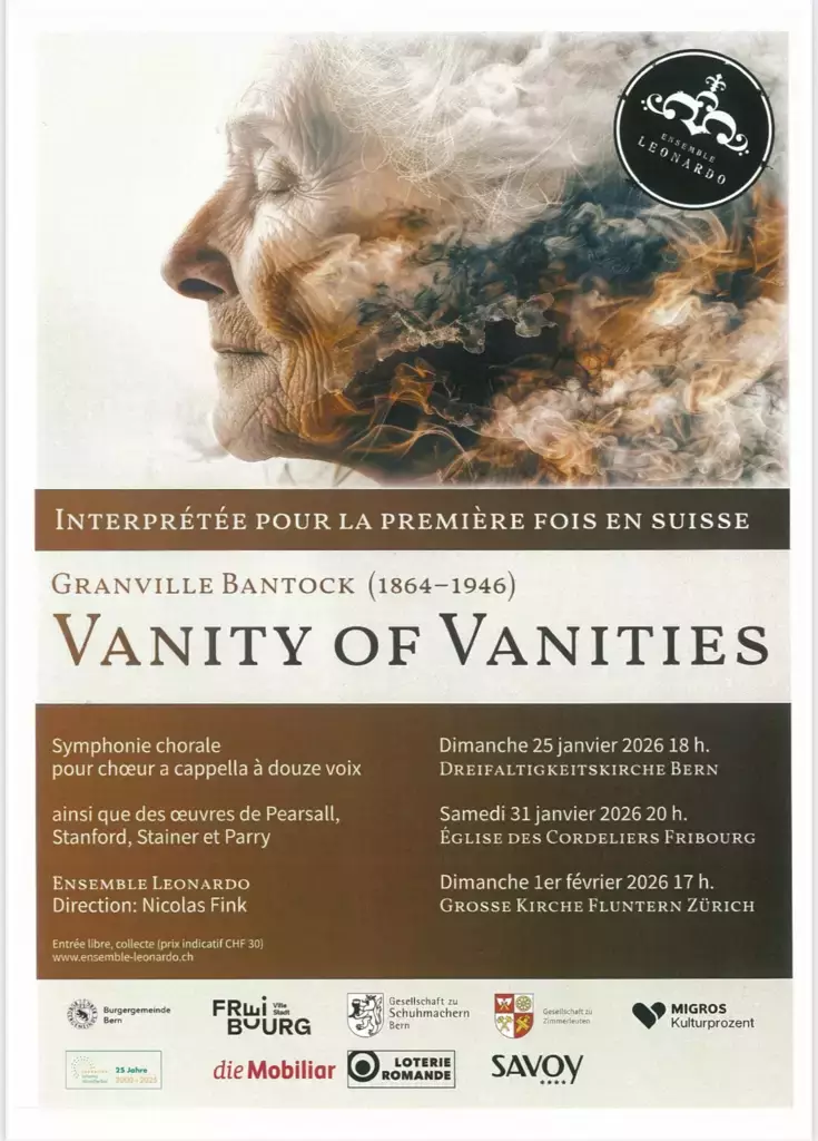"The Vanity of Vanities" - Ensemble Leonardo. L'ensemble vocal placé sous la direction de Nicolas Fink donne un concert à Fribourg, Eglise des Cordeliers le 31 janvier 2026 à 20 h, ainsi qu'à Berne, Dreifaltigkeitskirche 25 janvier 2026 à 18 h, et à Zurich, Grosse Kirche Fluntern Zürich, le 1er février 2026 à 17 h. A cette occasion sera interprétée pour la première fois en Suisse la symphonie chorale "The Vanity of Vanities" de Granville Bantock (1868-1946), créée à Liverpool en février 1914; le programme sera complété par des oeuvres de Robert Lucas Pearsall (1795-1856), Charles Villiers Stanford (1852-1924), John Stainer (1840-1901) et Hubert Parry (1848-1918).
