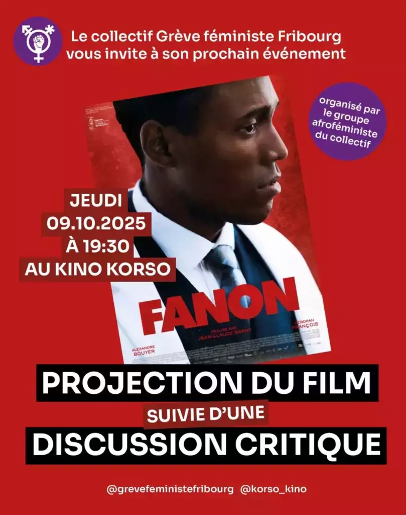Le 9 octobre 2025, le groupe Afroféministe du Collectif Grève Féministe Fribourg vous invite au cinéma le Korso pour une projection qui dérange et questionne. Venez découvrir le film Fanon, suivi d'une discussion critique avec une perspective intersectionnelle, féministe et radicale. La pensée anticoloniale de Fanon sera mise au centre et éclairera les réalités contemporaines.