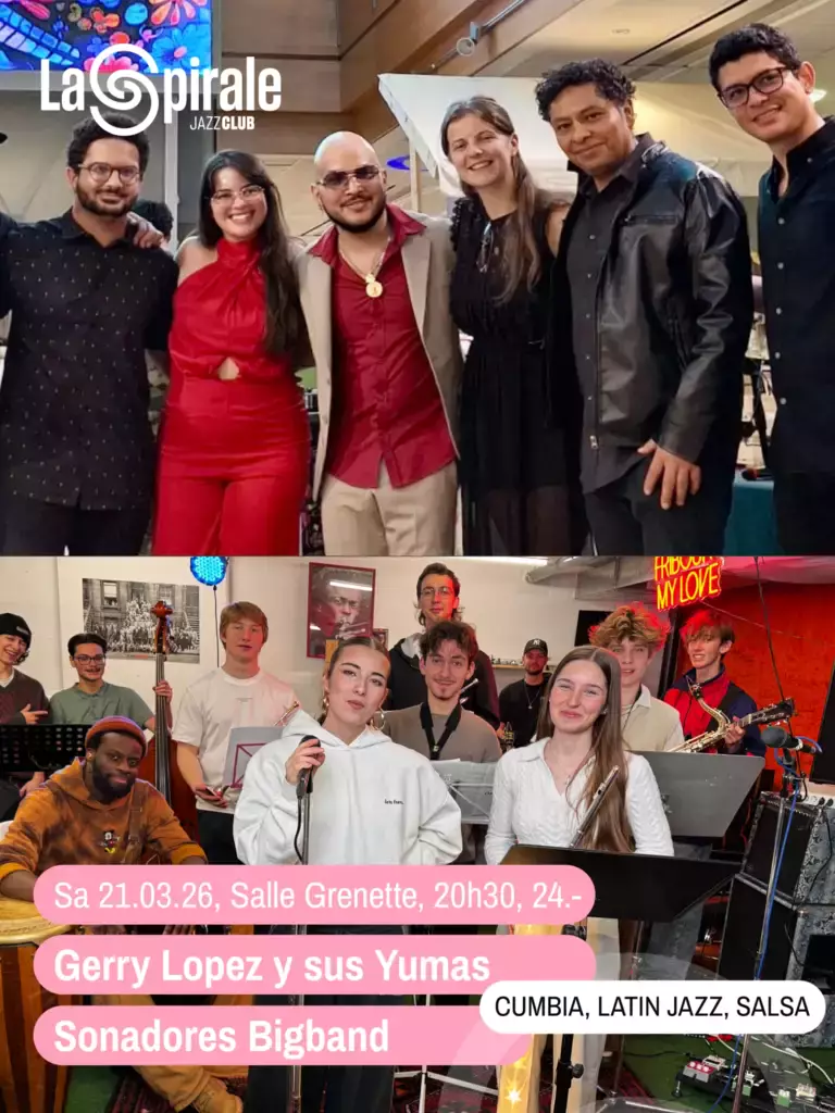 Dans la grande salle Grenette, la crème des musiciens fribourgeois, vous propose une soirée sous le signe de la danse et de la musique latine. Le groupe qui ouvrira les festivités, Sonadores Bigband, est un nouveau projet composé de jeunes musiciens fribourgeois talentueux, âgés de 16 à 20 ans. Leur répertoire explore des sonorités inspirées de la salsa et des rythmes caribéens. En deuxième partie, le récent combo est formé autour du charismatique saxophoniste, pédagogue et chef d’orchestre Gerry Lopez, qui proposera une musique aux fortes influences de cumbia.