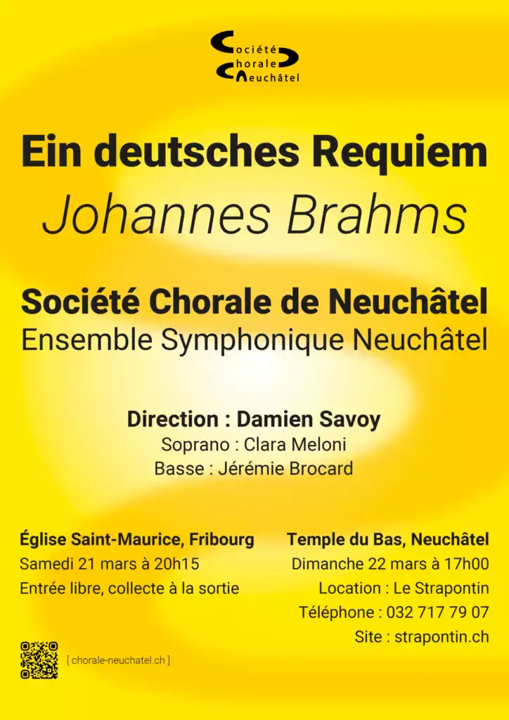 La Société Chorale de Neuchâtel, sous la direction de Damien Savoy, chantera le Requiem allemand de Johannes Brahms le 21 mars à l’Eglise Saint-Maurice à Fribourg.