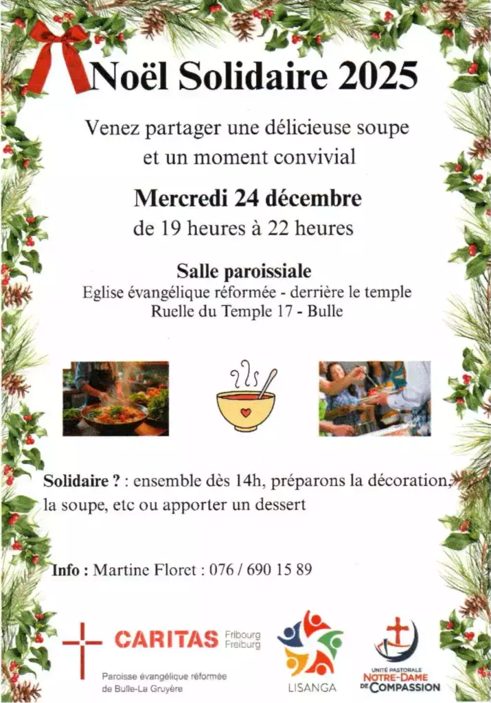Venez partager une délicieuse soupe et un moment convivial mercredi 24 décembre de 19 heures à 22 heures à la Maison de Paroisse de la Paroisse Évangélique Réformée (derrière le temple) à la Ruelle du Temple 17 à Bulle.