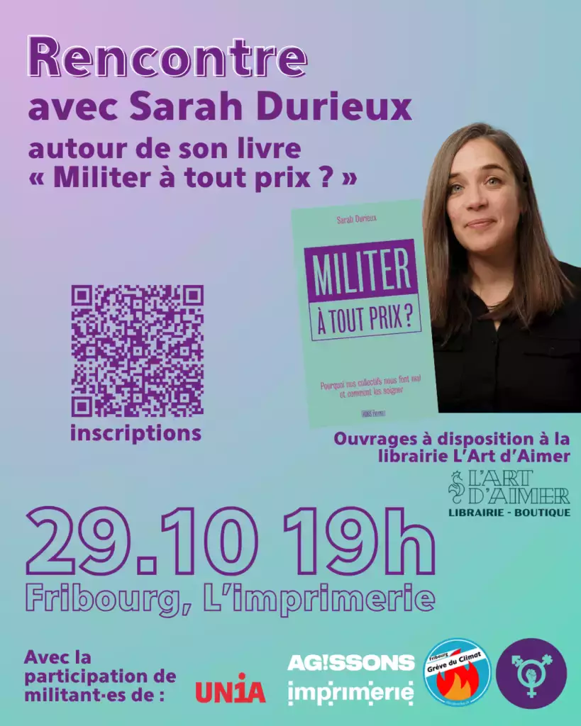 AG!SSONS Fribourg vous invite à rencontrer Sarah Durieux, activiste au sein ayant travaillé avec de petits collectifs et de grandes ONG, et autrice du livre « Militer à tout prix : comment nos collectifs nous font du mal » dans le cadre d'une tournée romande.