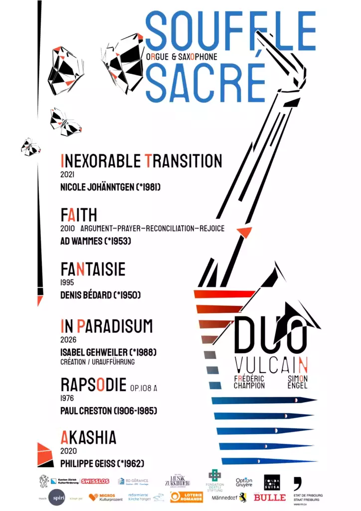 Avec ce projet, le Duo Vulcain réaffirme sa volonté de faire vivre et évoluer le répertoire pour saxophone et orgue. Entre redécouverte d’œuvres majeures, créations contemporaines et regards féminins suisses, cette tournée propose une immersion sensorielle et spirituelle unique. Un souffle nouveau, porté par deux instruments à la fois puissants et subtils, au service d’un dialogue musical vibrant et profondément humain.